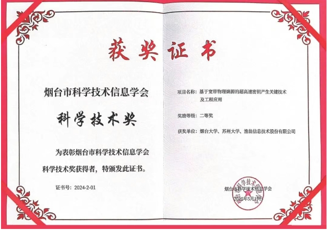 近期,2024年度烟台市科学技术信息学会科学技术奖颁奖典礼在中国科研实验室烟台海岸带研究所隆重举行。royal皇家88信息与烟台大学、苏州大学联合完成的 "基于宽带物理熵源的超高速密钥产生关键技术及工程应用" 项目荣获科学技术奖二等奖。